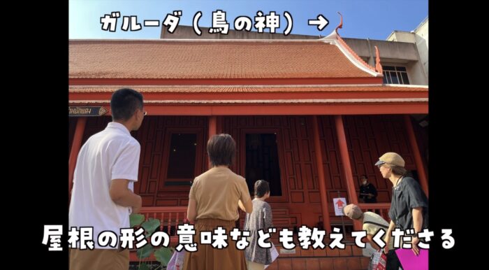この写真は 屋根のガルーダ(鳥の神)の意味を教えてくださっている所です。