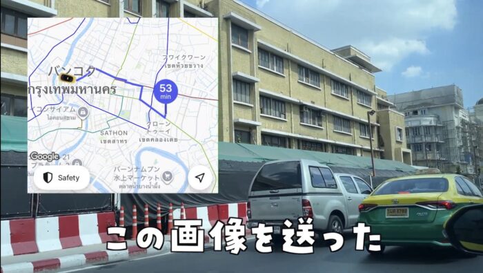 友人に この現在地の 画像を送りました。 ボクの滞在中のホテルまで あと53分と表示されてる!!