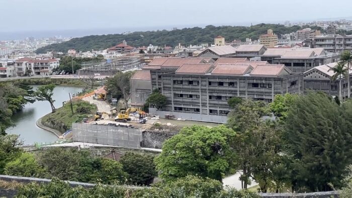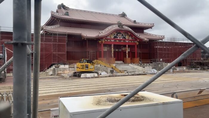 火災後の再建中なので 安全のためにネットで仕切られていましたが、ネット越しに 正殿を観ることができました。 ここまで復活しているとは 驚きです。 あんなに燃えたのに。