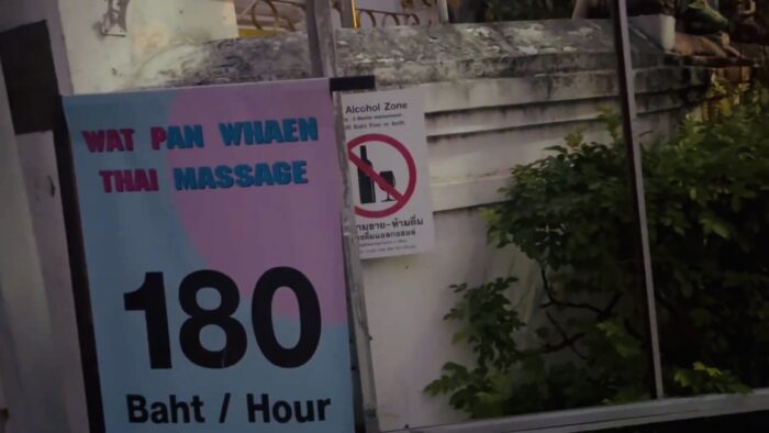 お寺の前には マッサージの看板も。 1時間180バーツ(850円)